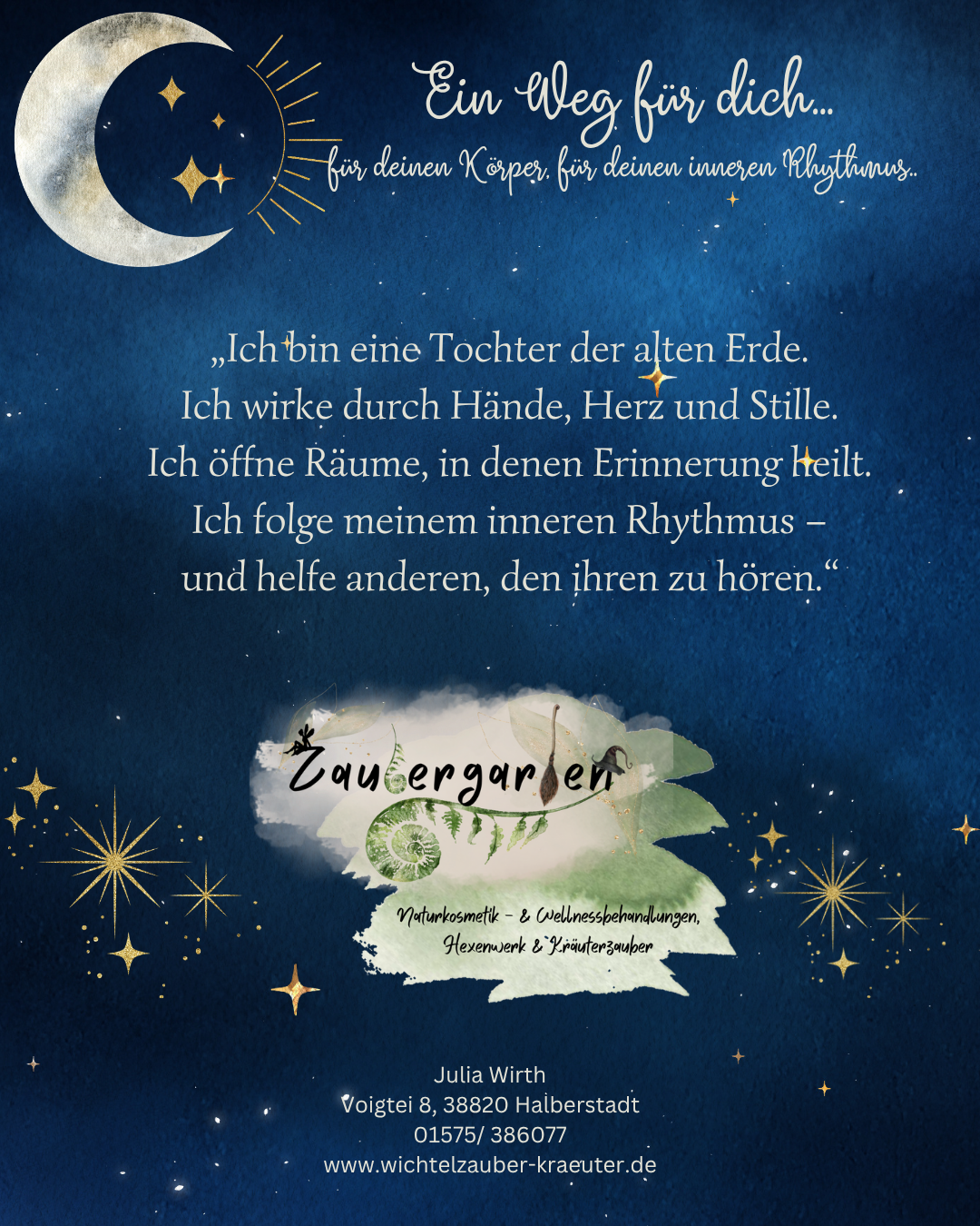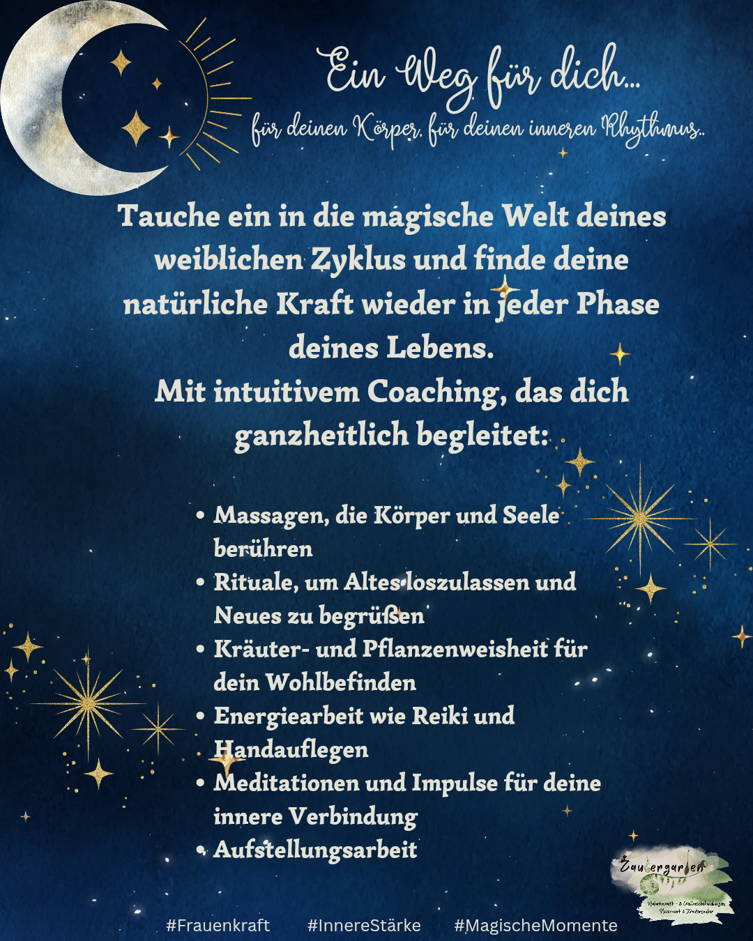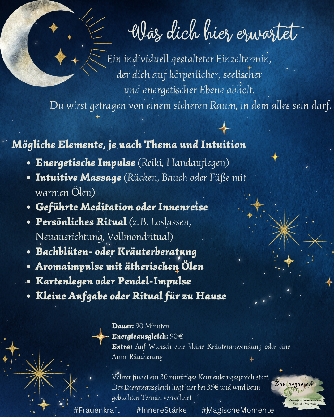 Der Zaubergarten bietet Frauen eine ganzheitliche, energetische Begleitung in verschiedenen Lebensphasen. Ob es sich um körperliche, seelische oder spirituelle Herausforderungen handelt, gemeinsam finden wir individuelle Wege, um innere Balance und Wohlbefinden zu stärken.