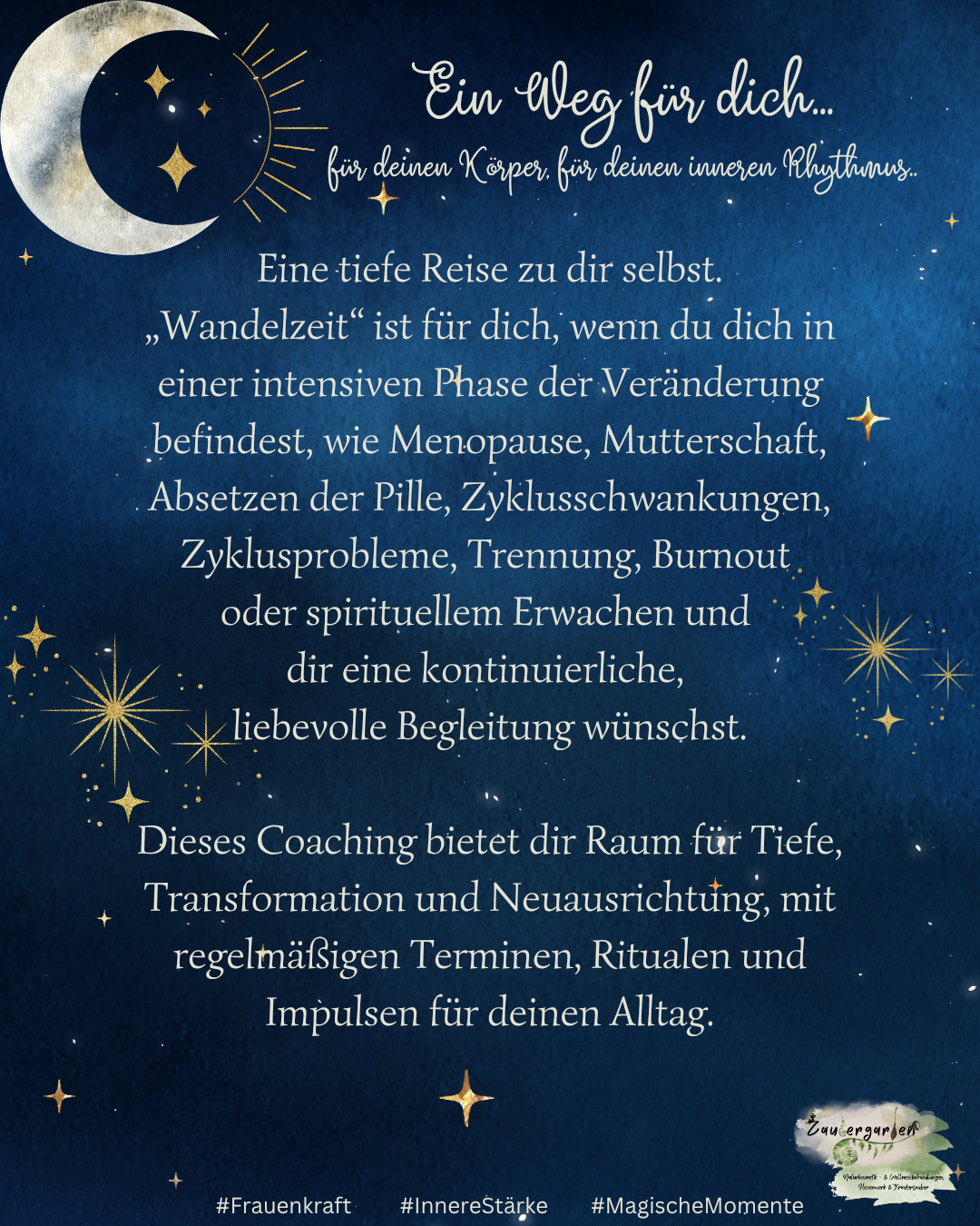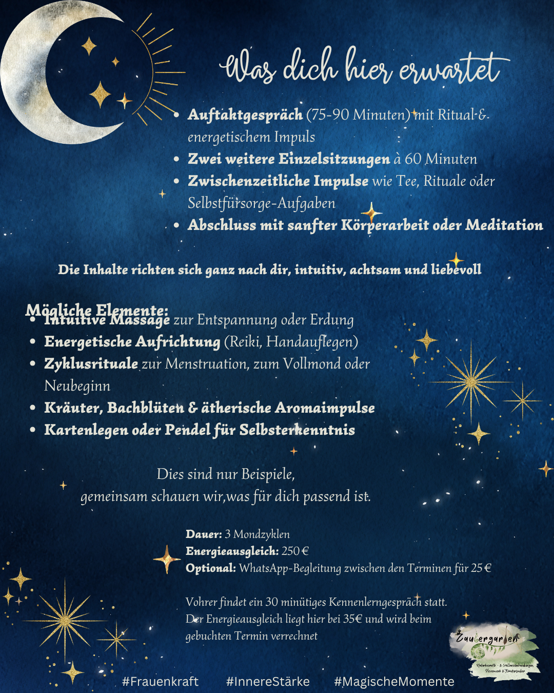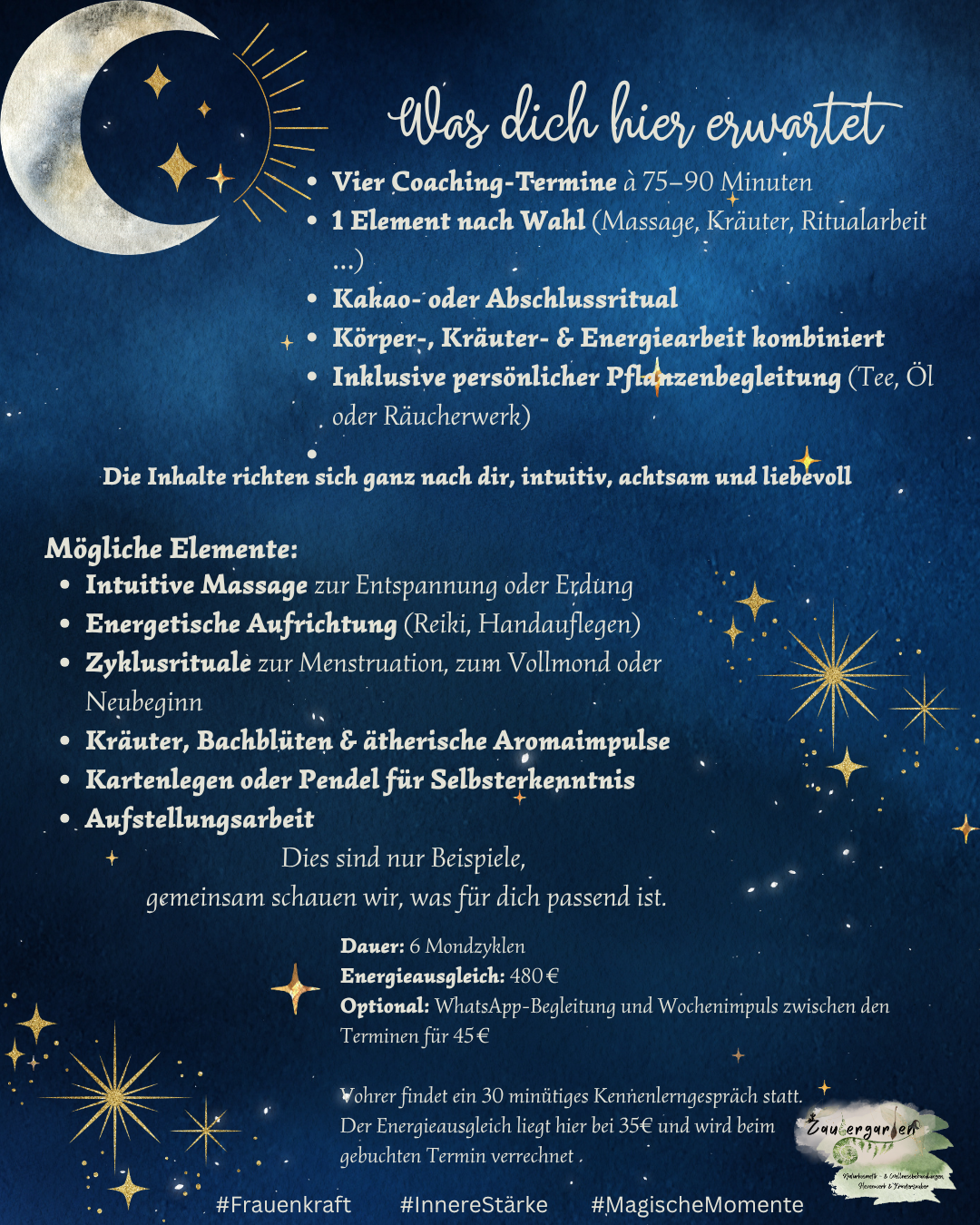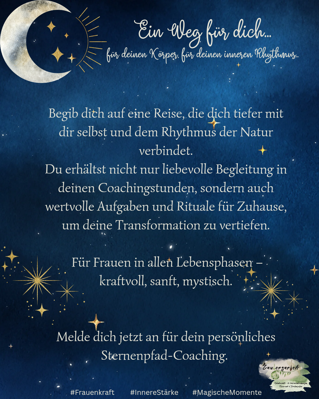 Deshalb biete ich dir verschiedene Möglichkeiten an, wie dein Sternenpfad aussehen kann. Ob du erst einmal hineinschnuppern möchtest, eine liebevolle Begleitung durch deinen Zyklus suchst oder dich tief in deine eigene Wandlung begeben willst, du entscheidest, was sich für dich stimmig anfühlt.